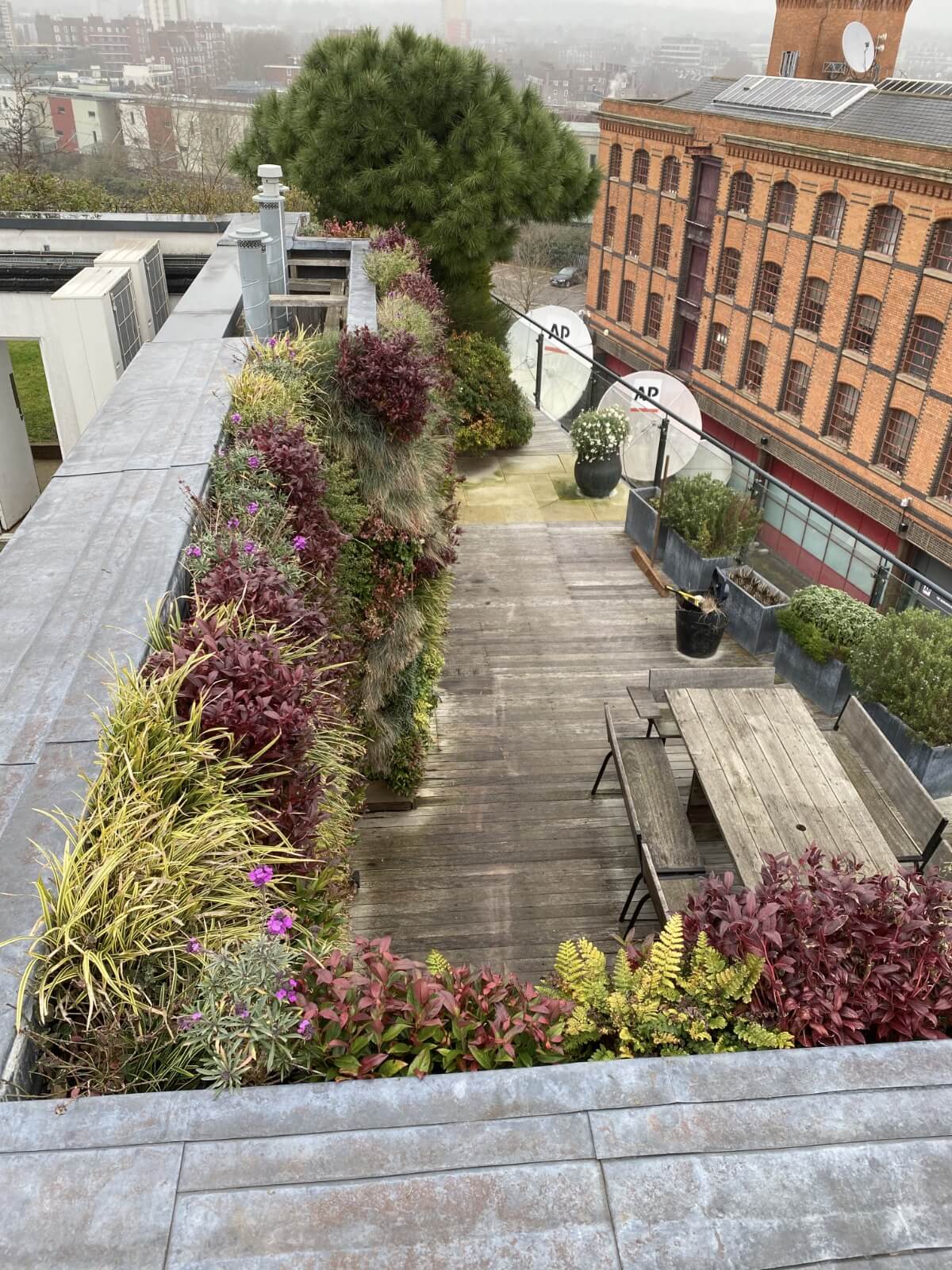 We’re sure you can see from our photo that this roof terrace garden in Camden, London, is something special. If you look at the rest of the picture, there are buildings all around. The living walls we installed, and the smaller planters, are the only green you can see. Just imagine how it feels to come out onto the roof of this building and enjoy this beautiful space, right in the middle of the city. For the people who work here, it’s a great place to stop and relax during a busy day, with amazing views over the whole area.